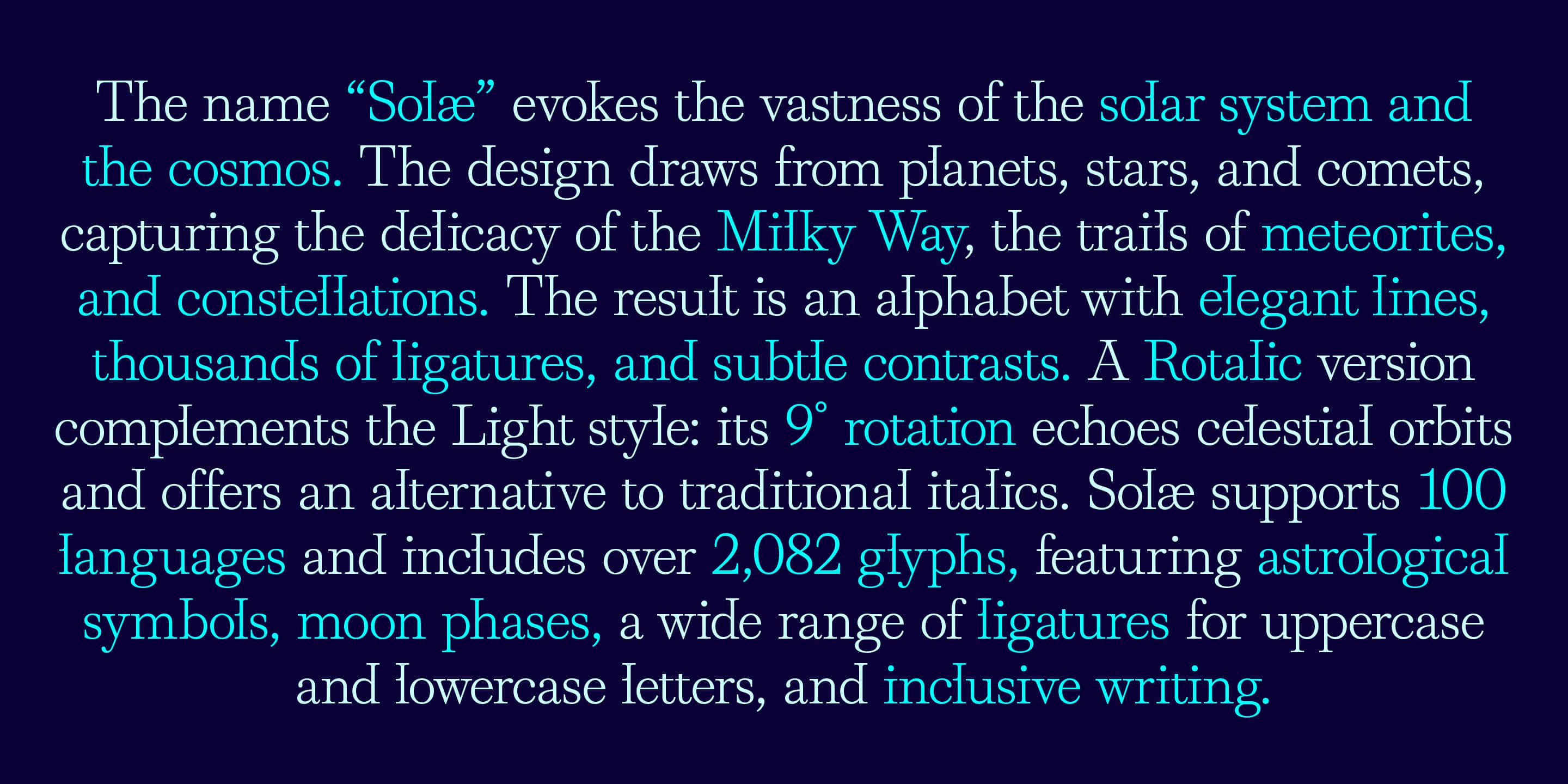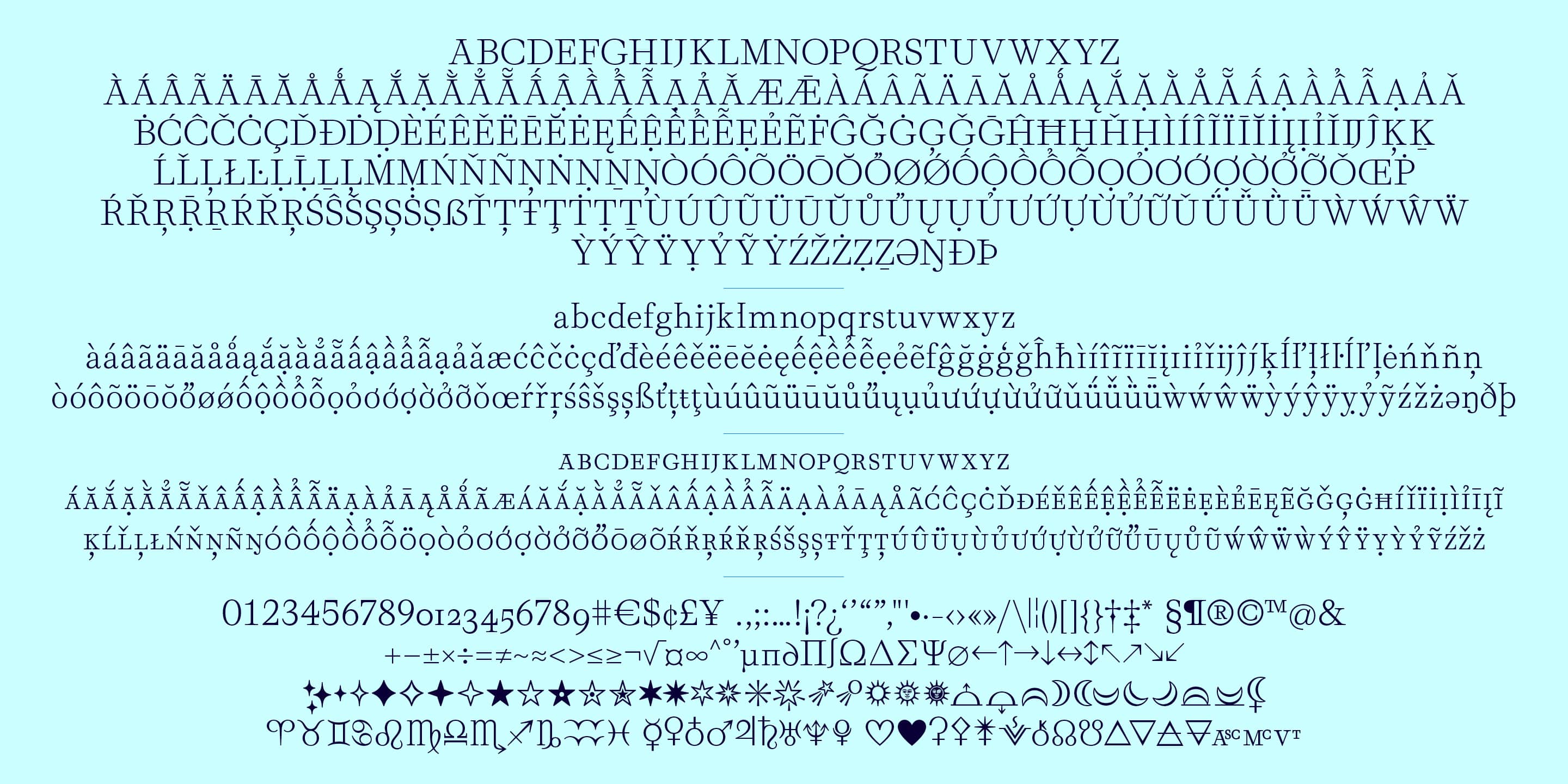 With over 2,082 glyphs and support for 100+ languages, Solæ includes astrological symbols, moon phases, a wide range of uppercase and lowercase ligatures, and a full set of characters for inclusive writing.