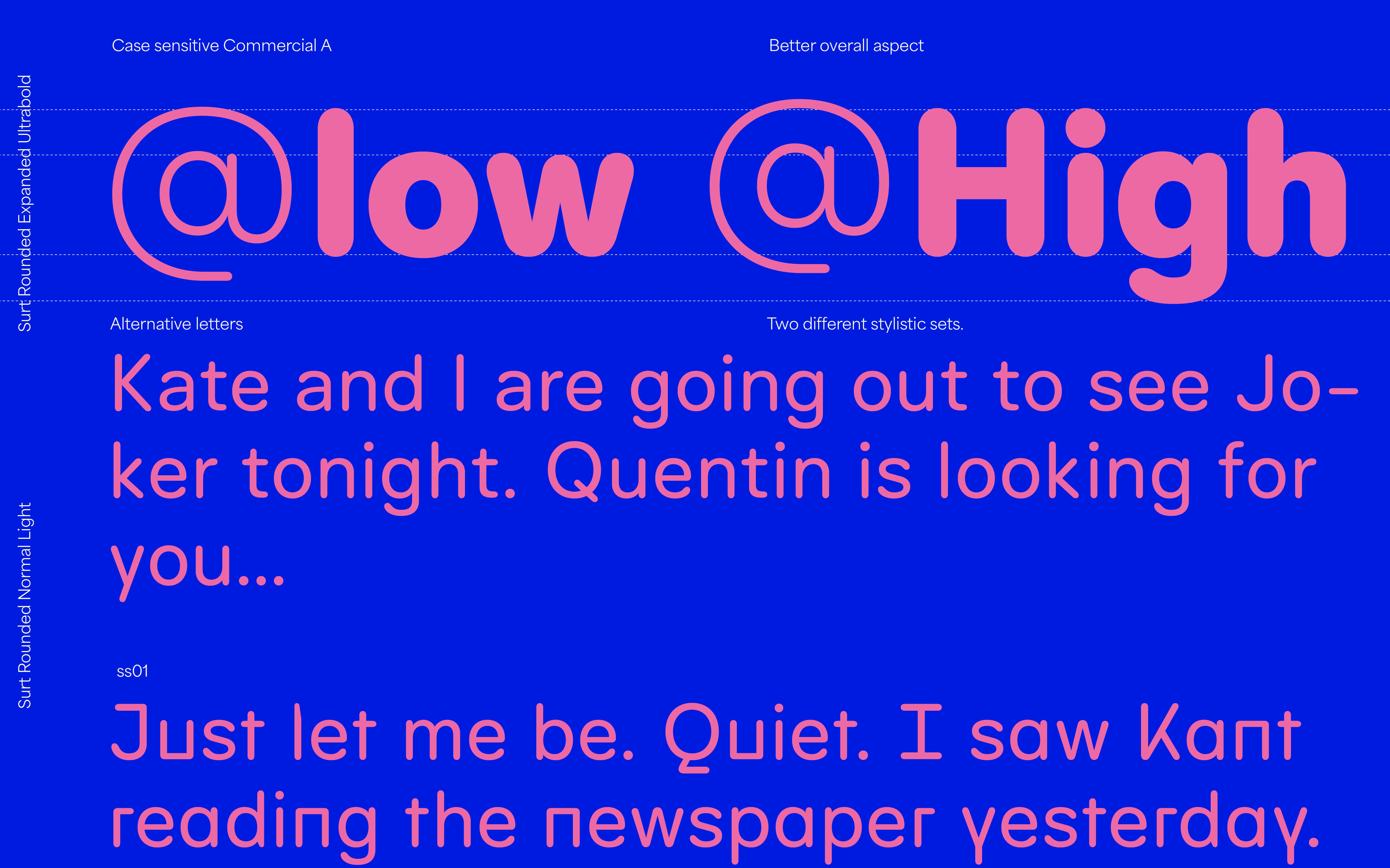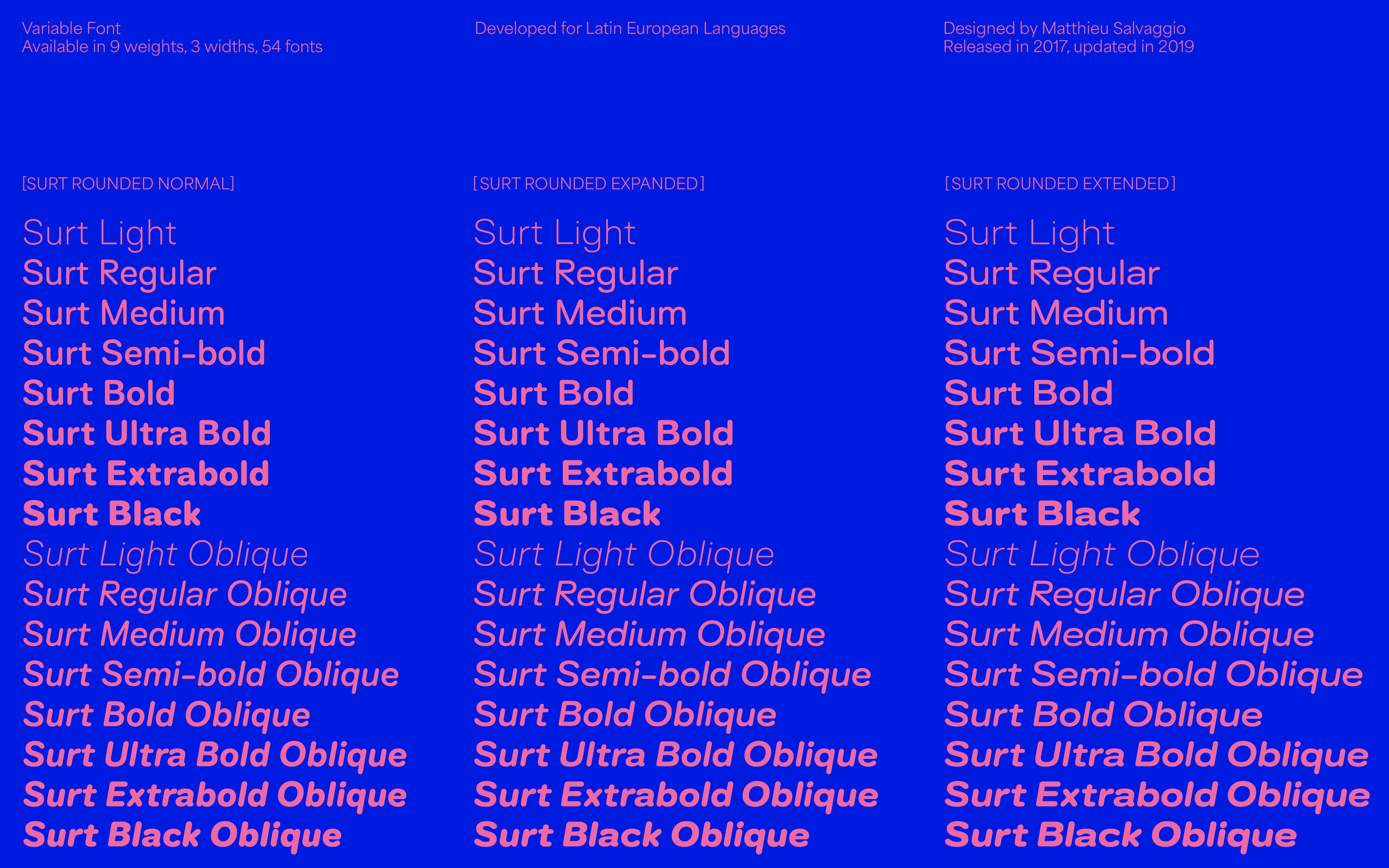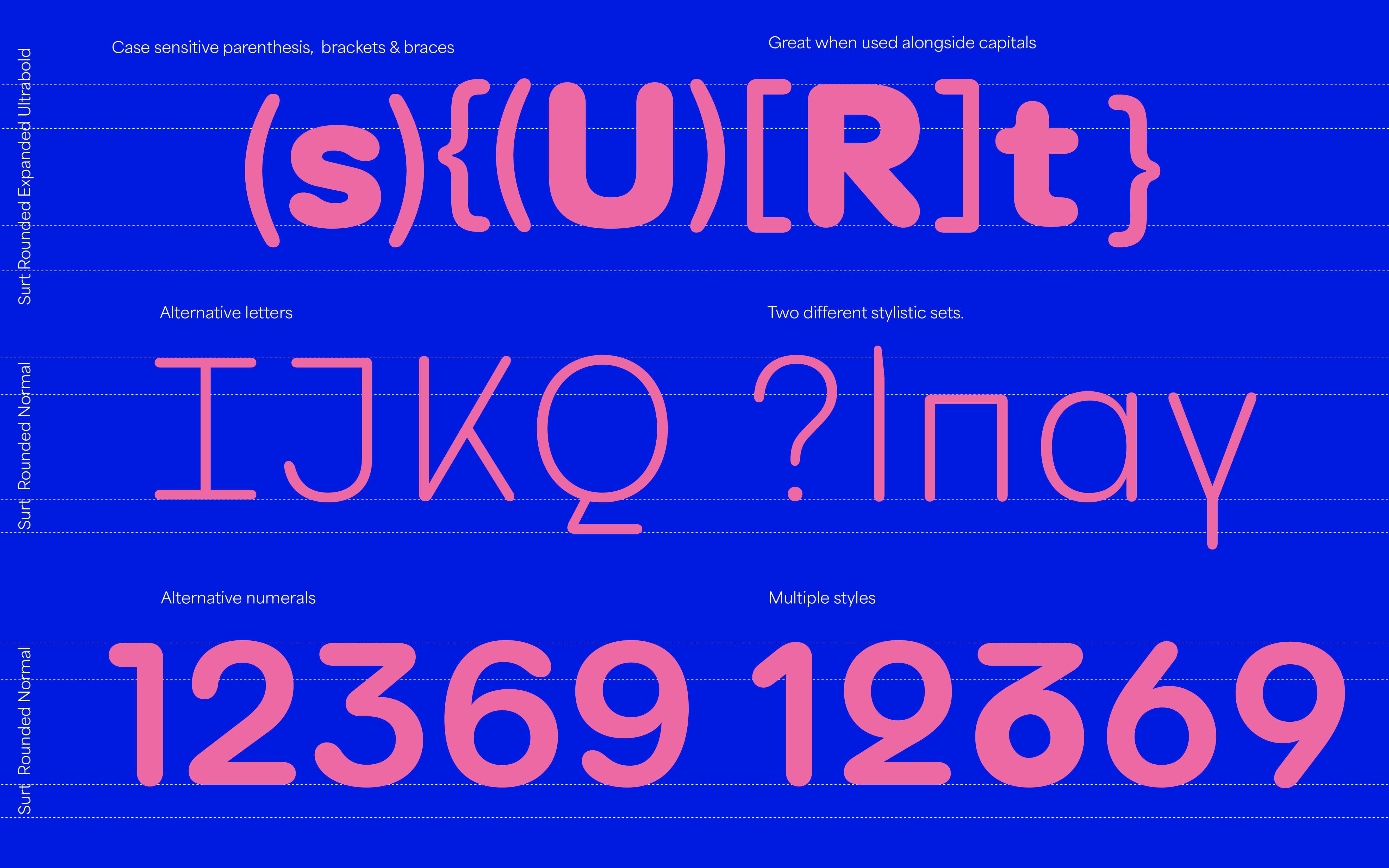 While the history of geometric fonts can be traced back to the early days of the modernist movement in the early twentieth century. Surt's inspiration is more contemporary and in link to strong brutalist architecture than historical geometric or even neo grotesque like fonts.
